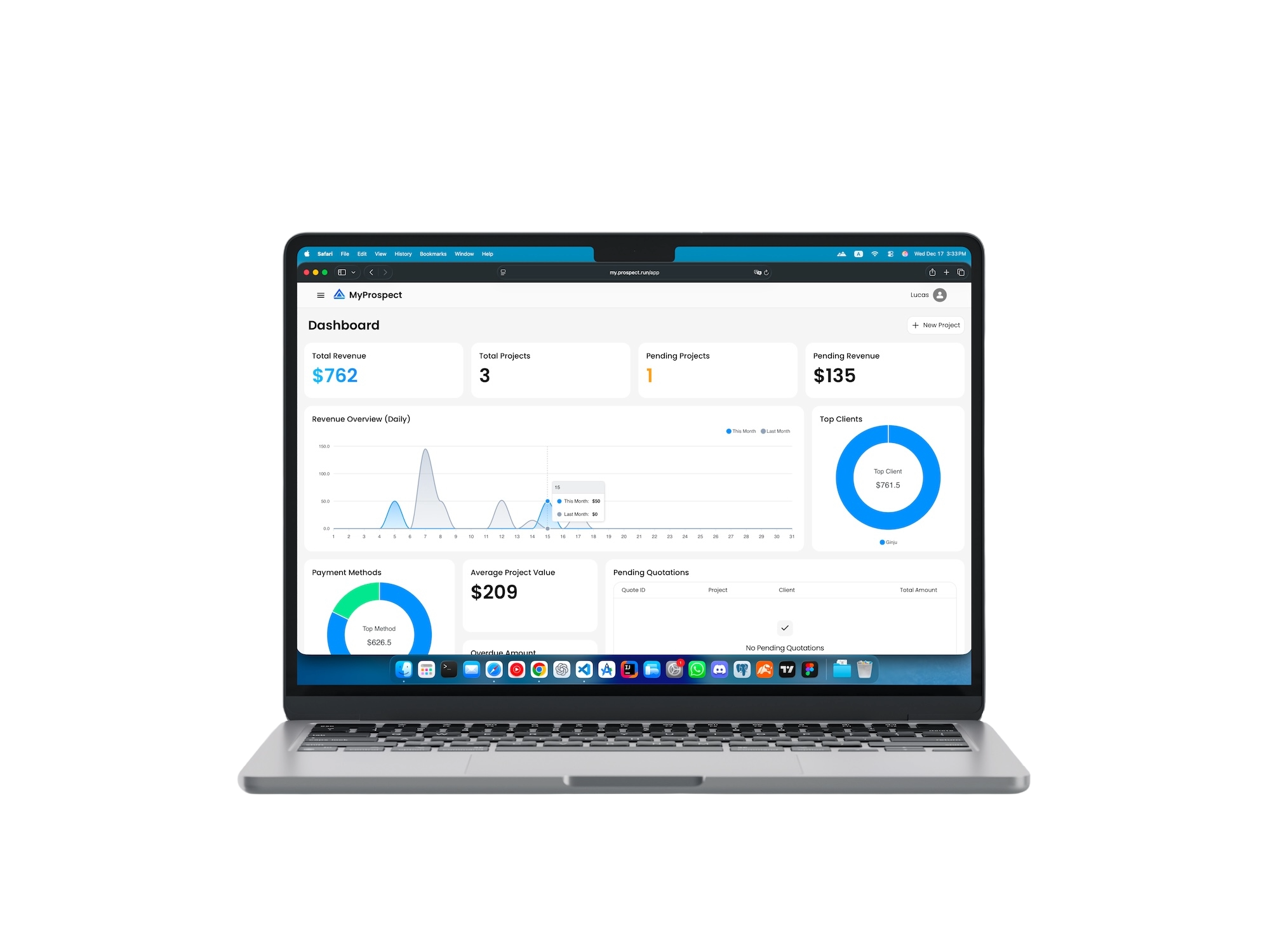 Know your numbers. Track total revenue, pending payments, and project health without opening a single calculator.
